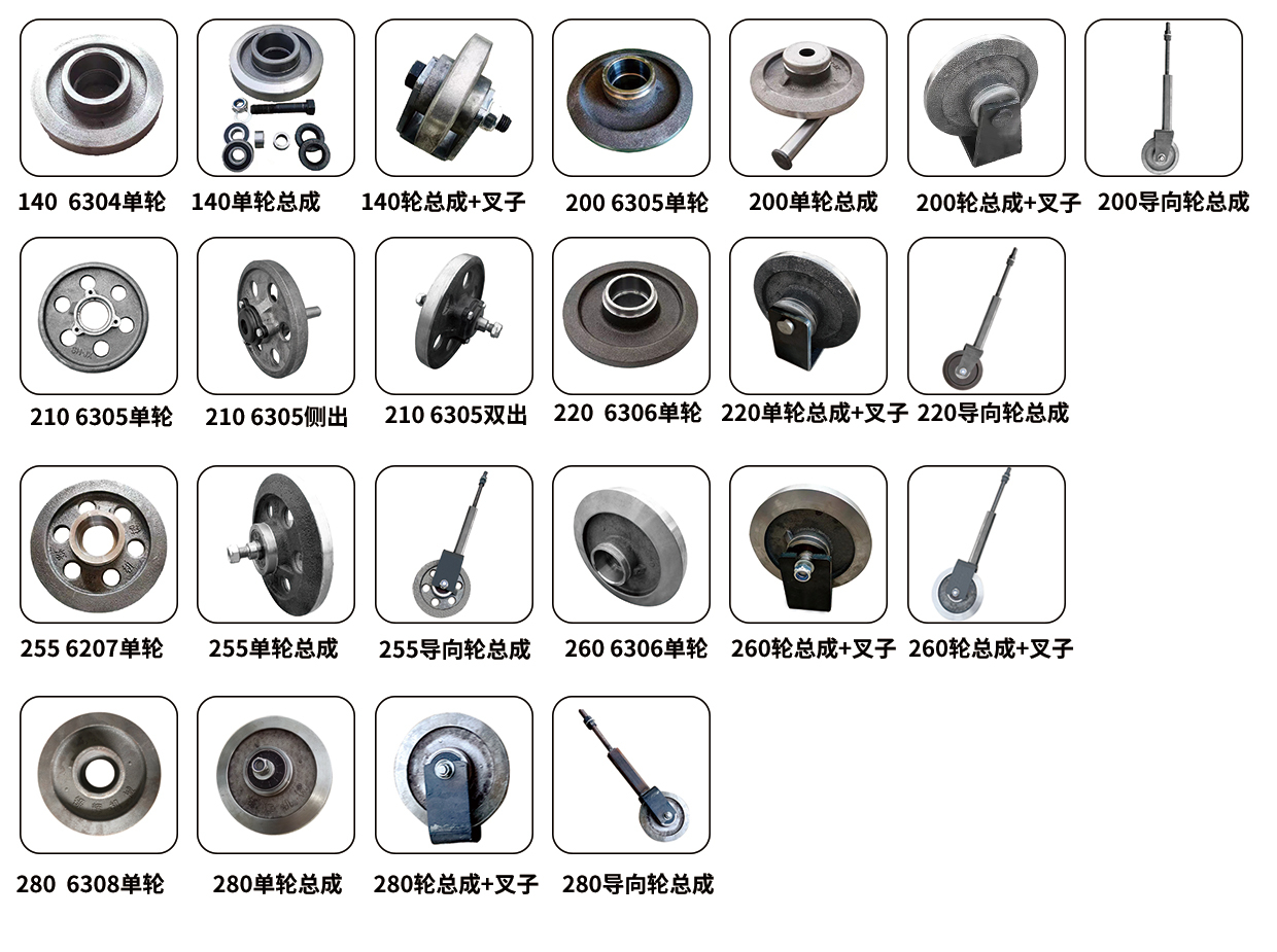 導向輪由鑄鋼制造,型號多種多樣,有直徑140  200  210  220  240 260  280等多種選擇可以適應各種寬窄齒履帶需求,尺寸造型精密,結實耐用,防水耐磨,可以很好的做到引導履帶正確繞轉的作用。